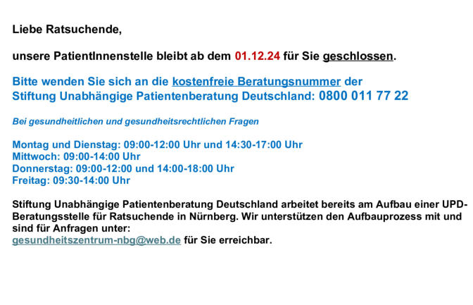 *** BITTE BEACHTEN ***  Patientenberatung vom Zentrum für Gesundheitsförderung Nürnberg e.V. wird zum 01.12.2024 bis auf Weiteres eingestellt.